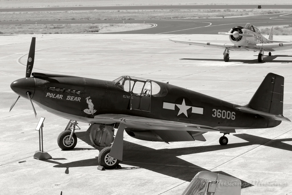 In 1977 Waldon "Moon" Spillars recovered 43-6006 from a remote mountainous area of Alaska. 006 had crashed there on 16 Feb 1944, killing her pilot Lt. Edward W. Getter of the USAAF. Spillars embarked on a difficult restoration with not many P-51A parts to be found. He ended up using many parts from P-51Ds to finish the restoration. Polar Bear flew in 1985 for the first time since the 1944 crash.