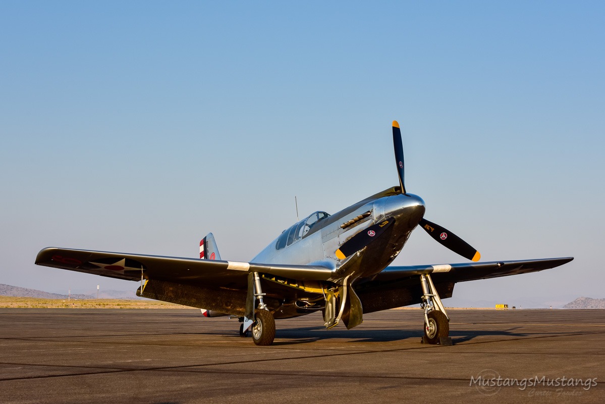 The week went near perfect. Little John looked like a seasoned pro rounding the pylons. Lucky for us fans and photogs, they towed her out onto the ramp for some photos in the soft evening light at Stead Field. After the races were over, the team applied more markings that make this P-51A look just like XP-51 #1039.