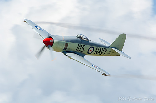 He would rebuild that Centaurus radial on his own. The Centaurus is an 18 cylinder radial engine - 2 rows of 9. The Centaurus has an interesting sleeve valve geometry. The metallurgy of the sleeves would prove to be troublesome for long term use. Getchell was an expert on that engine. He could tell you everything about it, all you needed was a day or so and a real compfy chair. The Centaurus has a very pleasing unique sound. Many Sea Fury owners have decided to fit a Pratt/Whitney radial to the Sea Fury since the parts are much easier to get. Getchell wanted nothing to do with that. You can usually spot the Centaurus powered versions with the beautiful 5-blade propeller up front. The Pratt & Whitney powered models use a 4-bladed prop. Another difference between the two powerplants is that the Centaurus turns the wrong way ;) Getchell flew the Sea Fury, but also the P-51 and AT-6 and had to switch between left rudder on takeoff and climbout in the Sea Fury, vs right rudder on the others.